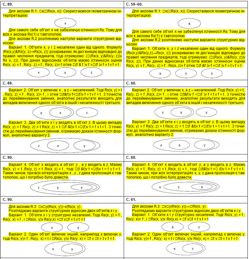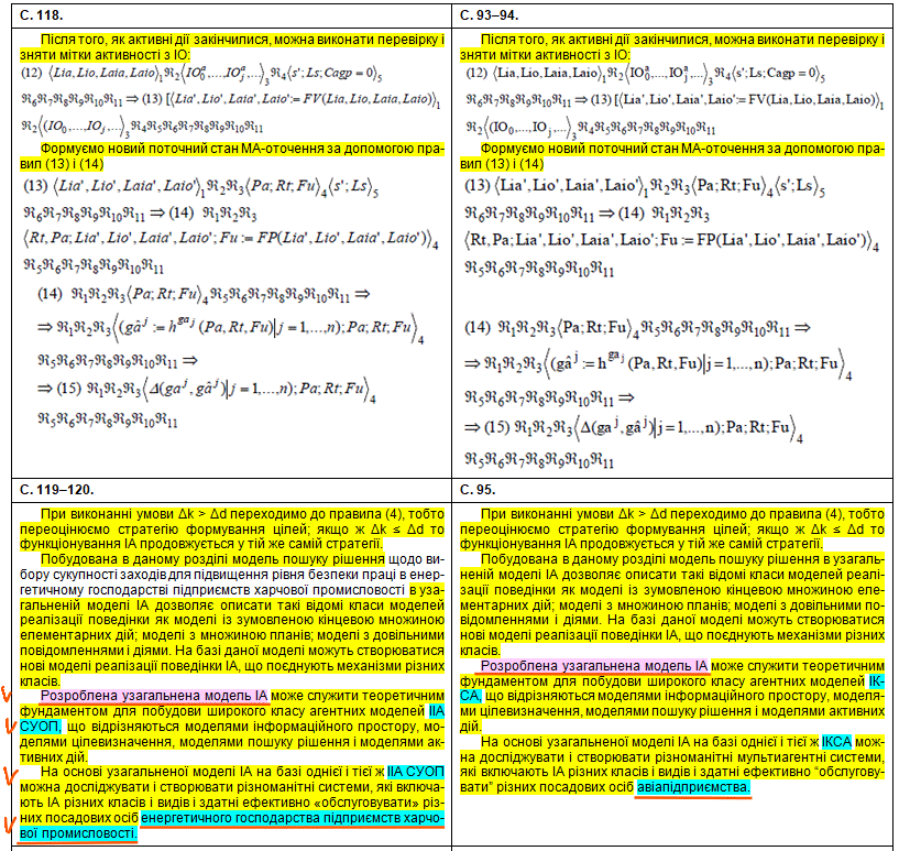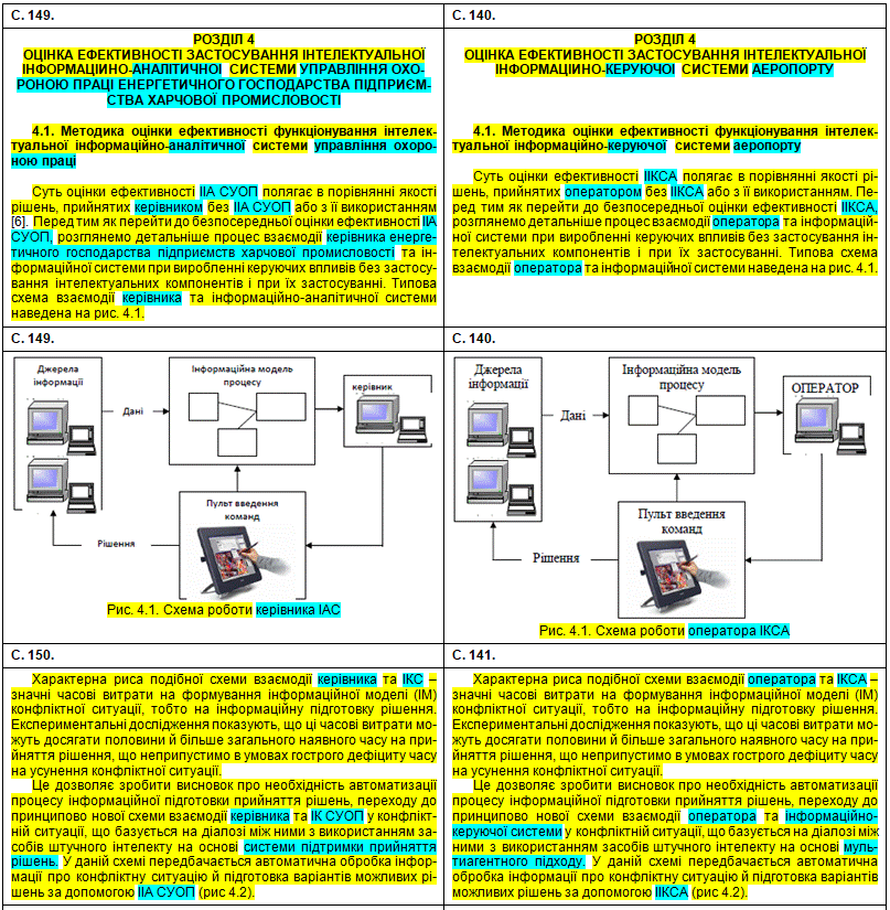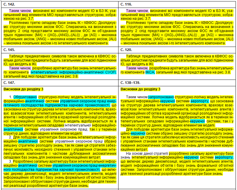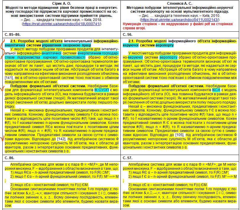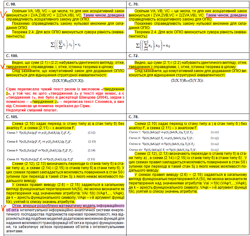 Коли Слюняєв переписував текст російської дисертації А. Швецова, то замінював «CDSS» на «АІМS» та «КС» на «ІКСА»; у свою чергу в дисертації Слюняєва Марченко замінював «інформаційний об’єкт» на «логічний об’єкт», «ІО» на «ЛО», «ОПІО» на «ОПЛО», «АІО» на «АЛО» та «ПІО» на «ПЛО»… Ну а мадам Сірик у тексті Слюняєва перетворювала «інформаційно-керуючу систему аеропорту» на «інформаційно-аналітичну систему енергетичним господарством підприємства харчової промисловості» («систему… господарством» – це такий стиль дисертантки – В.С.) або на «інформаційно-аналітичну систему управління охороною праці», замінила «структурні підрозділи аеропорту» – на «структурні підрозділи енергетичного господарства», абревіатури «ІКСА» на «ІІА СУОП» або «ІКС», замінила вислів «посадових осіб авіапідприємства» на «посадових осіб енергетичного господарства підприємств харчової промисловості» і тому подібне.
