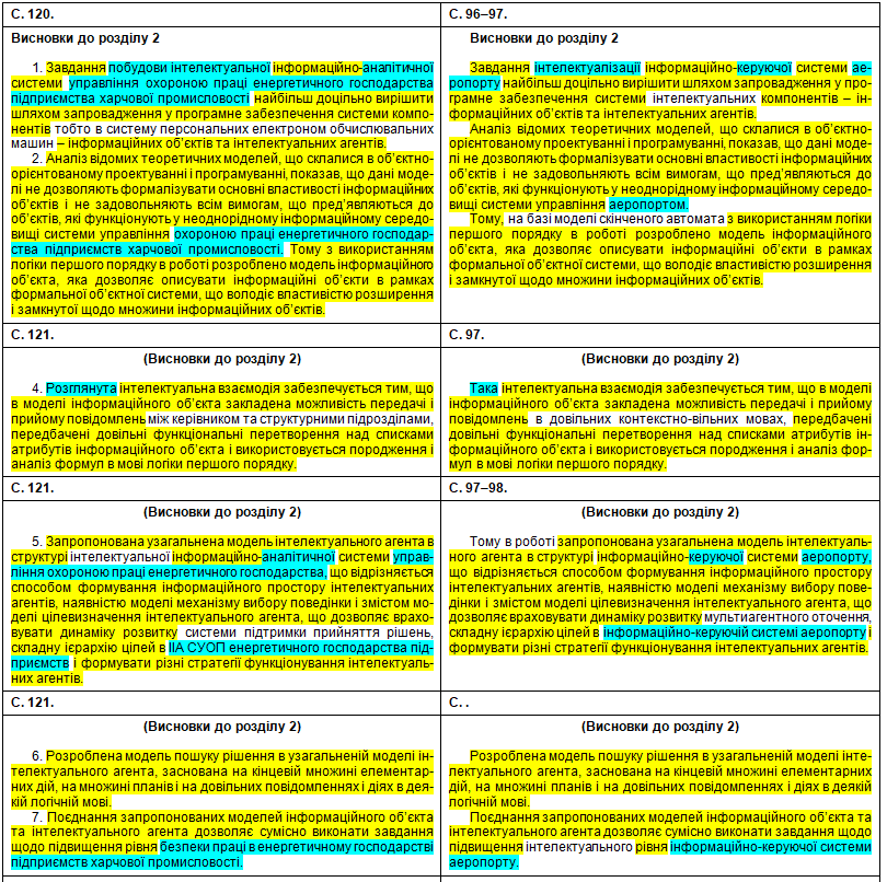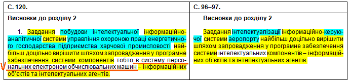 Основний текст викладений на сс. 31–68, 85–121, 125–147, 149–172 та 176–179, усього 126 сторінок. Академічний плагіат виявлений на сс. 85–121, 125–147, 149–157 і 172, тобто на 69 сторінках, що складає 55% основного тексту.