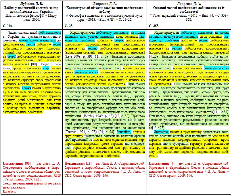 Той самий переписаний Лубінцем текст є і в статті: Лавренов Д. А. Основні моделі політичного лобіювання та їх особливості // Гілея: науковий вісник. – 2015. – Вип. 94. – С. 358–362 (див. тут). Ця стаття значиться в списку літератури дисертації Лубінця під №79 і згадується один раз посередині с. 105. Ну а в Порівняльній таблиці наведені збіги тих фрагментів, де відповідного покликання на статтю Лавренова немає.