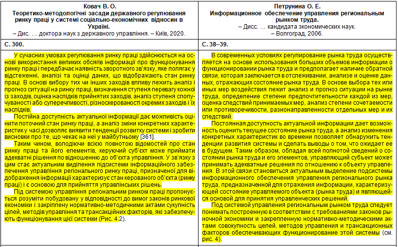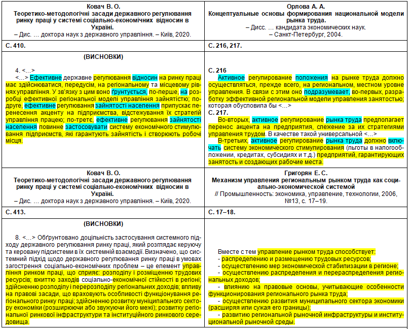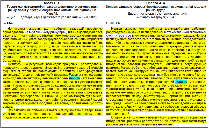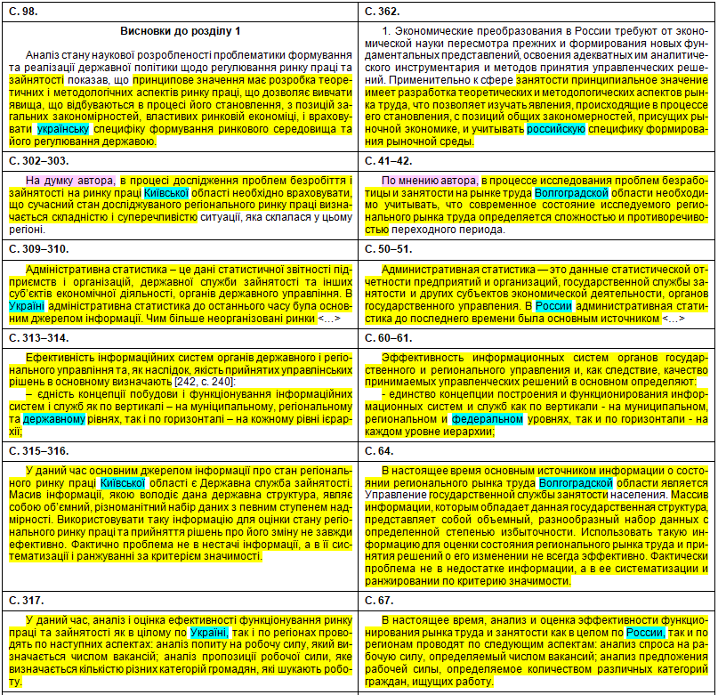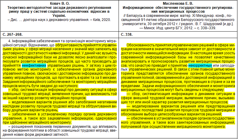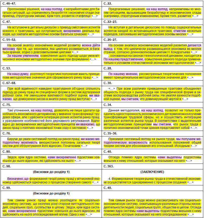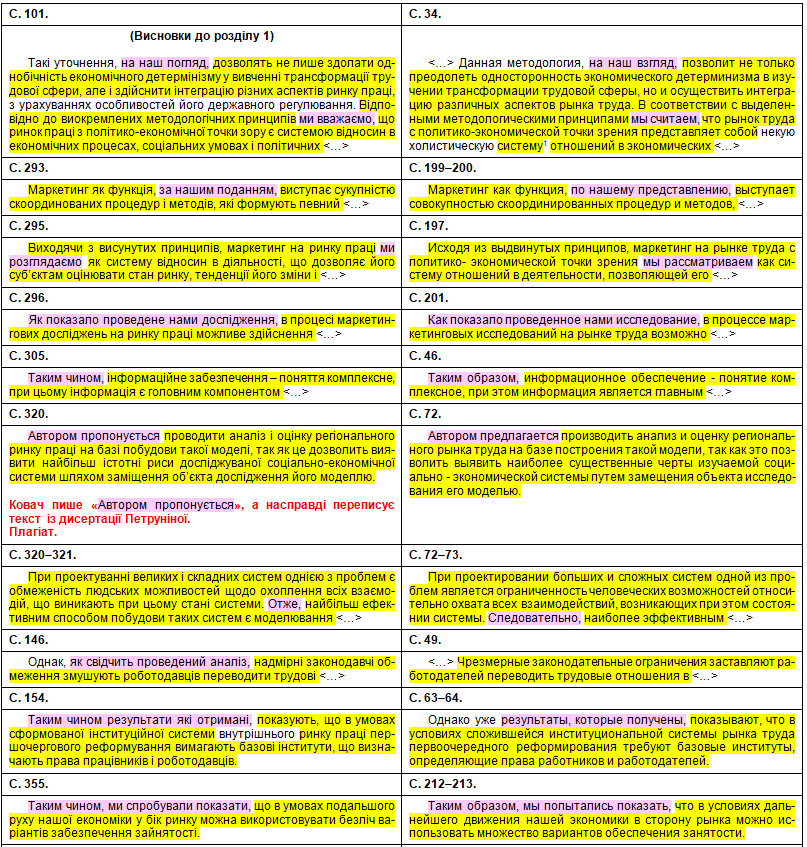 Збіги текстів виділені жовтим кольором, перефразування та синоніми – бірюзовим, перестановки слів місцями – зеленим, а твердження авторки про те, що це нібито вона щось пропонує, оцінює, розробила чи робить висновки – фіолетовим.