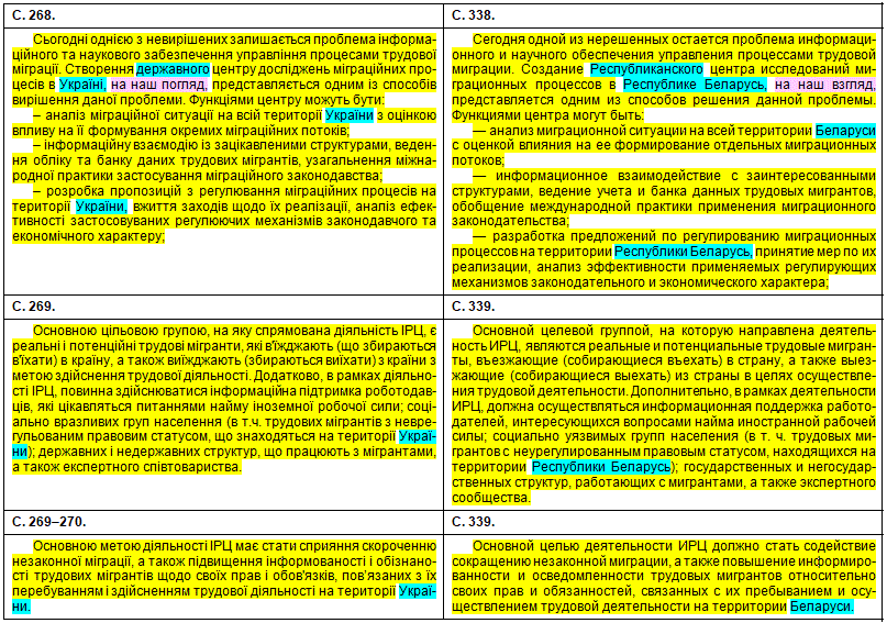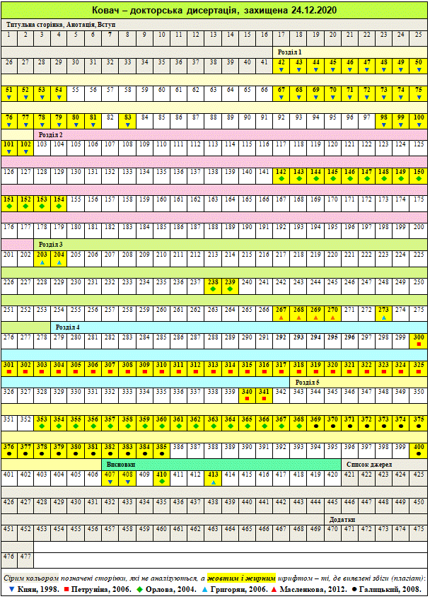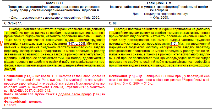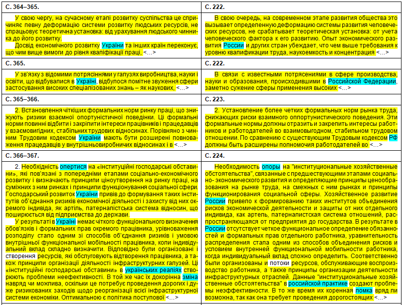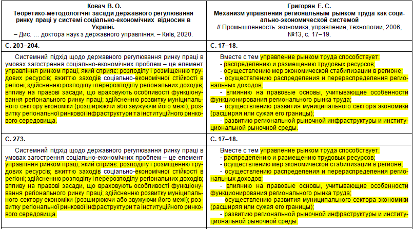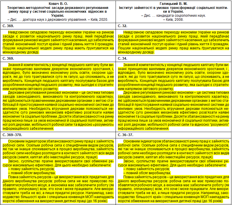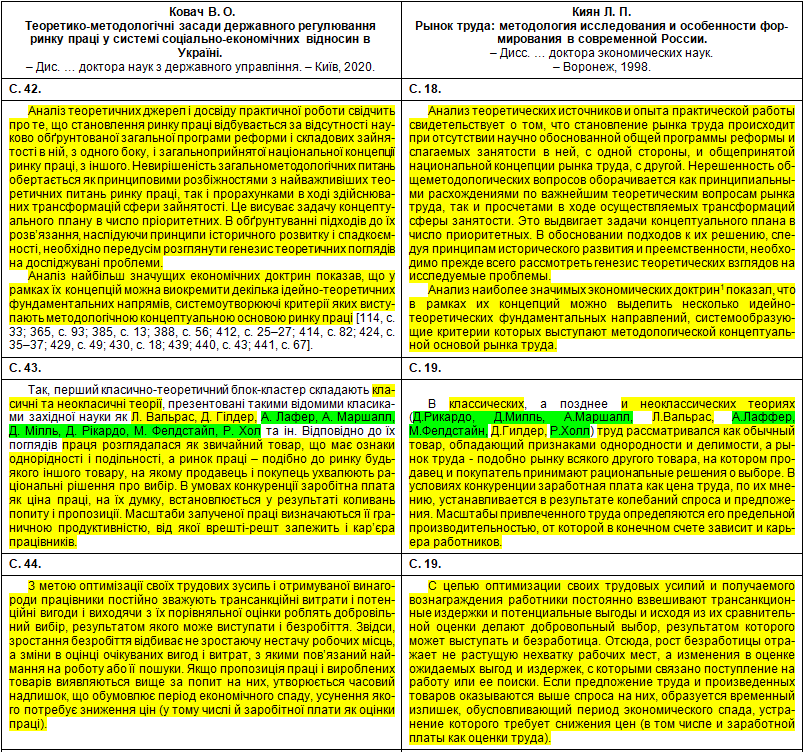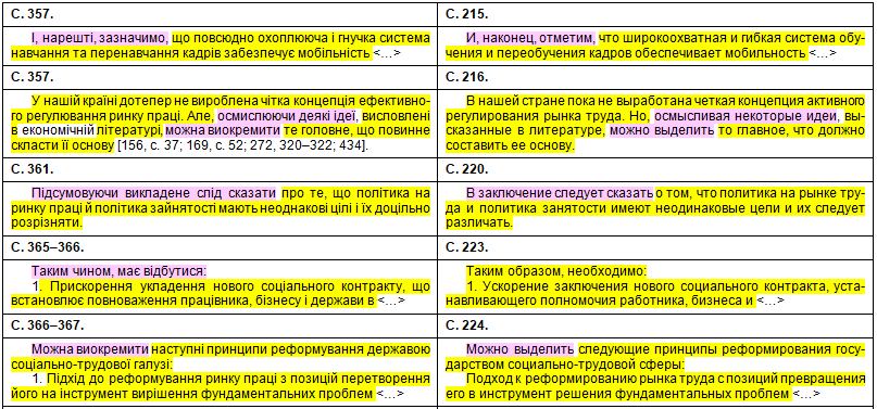 Збіги текстів виділені жовтим кольором, перефразування та синоніми – бірюзовим, перестановки слів місцями – зеленим, а твердження авторки про те, що це нібито вона щось пропонує, оцінює, розробила чи робить висновки – фіолетовим.