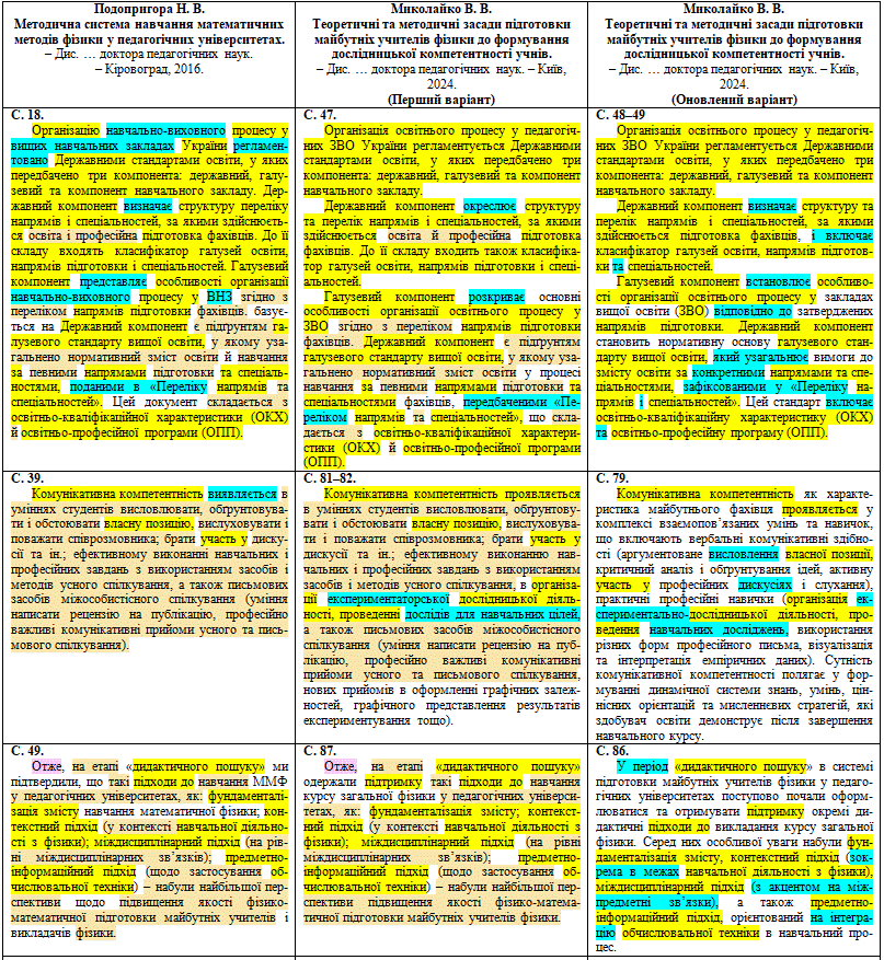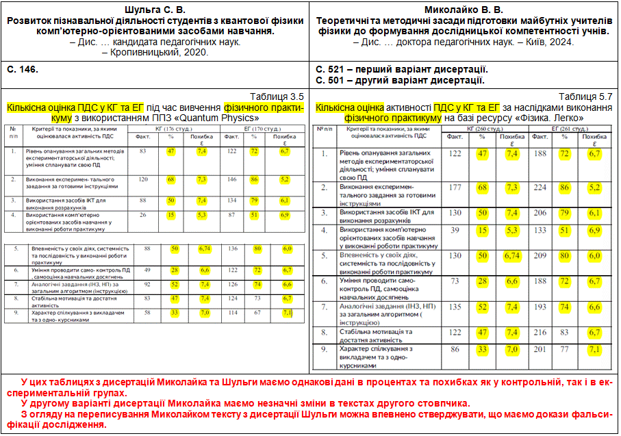 Те саме й з таблицями: наприклад, таблиця 5.2 (с. 479 у новій версії та с. 500 у старій) нібито з результатами дослідження Миколайка – це таблиця 3.2 на с. 140–141 дисертації кандидата пед. наук С. Шульги (Кропивницький, 2020), тільки була підмінена кількість студентів (тобто маємо фальсифікацію даних).