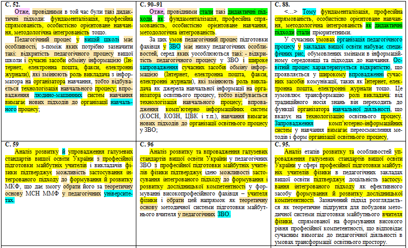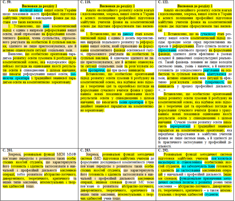 Спочатку подивимося уважно на тексти двох варіантів дисертації, а потім розберемо самі pdf-файли. У першому стовпчику таблиці наведемо джерело плагіату, потім – перший варіант дисертації із сайту НРАТ, а в третьому стовпчику – оновлений текст. Порівнювати перш за все будемо два варіанти дисертації Миколайка між собою, а оранжевим кольором виділимо збіги першої версії дисертації з джерелом плагіату. Із 248 плагіатних сторінок виберемо окремі фрагменти. Як бачимо, здійснений рерайтинг спричинив суттєві зміни в тексті і розбіжності з першоджерелом списування: