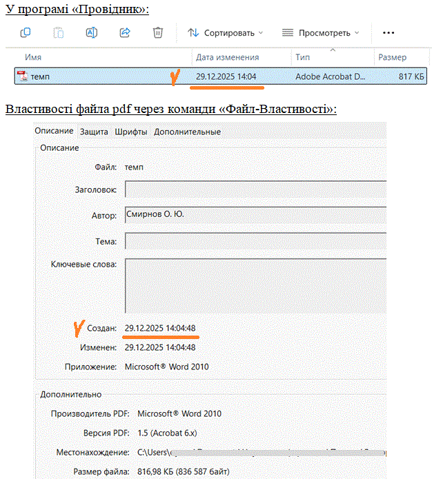 Проведемо контрольний експеримент: візьмемо для прикладу який-небудь файл програми Word і збережемо його у форматі pdf. А тепер порівняємо дату в «Провіднику» і дату і час створення файла через команди «Файл-Властивості» і переконаємося, що в обох варіантах вона однакова – 29.12.2025, 14:04. Ну, власне, це очікувано, нічого дивного: