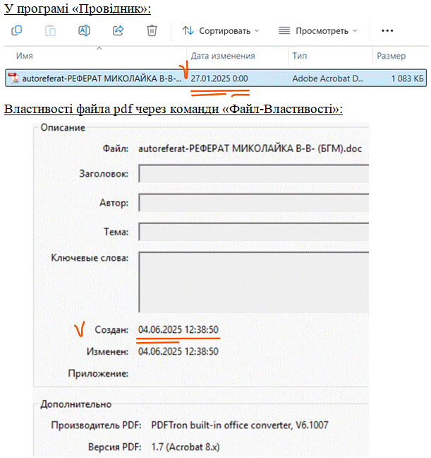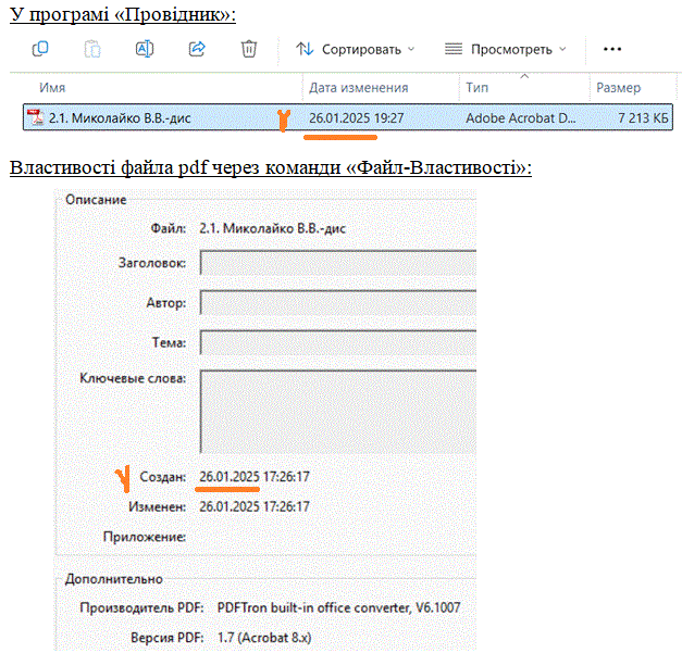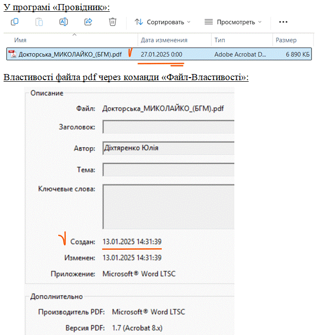 Тоді для чого була зроблена ця фальсифікації даного файла? А щоб його «зовнішня» дата створення була такою самою, як і дата створення файла дисертації. Пам’ятаєте? 27.01.2025 0:00, рівно опівночі.