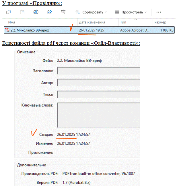 Що це означає? Та тільки те, що час створення файла, який відображається в Провіднику, був штучно змінений на більш пізній. Це зробити неважко. Але коли змінюється дата, то автоматично виставляється час 0:00, що й підтверджує зовнішнє втручання. Ну не сидів же автор 27 січня до ночі, щоб рівно в нульову годину зберегти файл у форматі pdf. Ні, бо інакше ця дата й час збереглися б і в «середині» файла, у його «внутрішніх» властивостях.