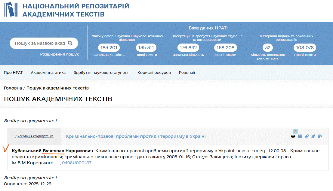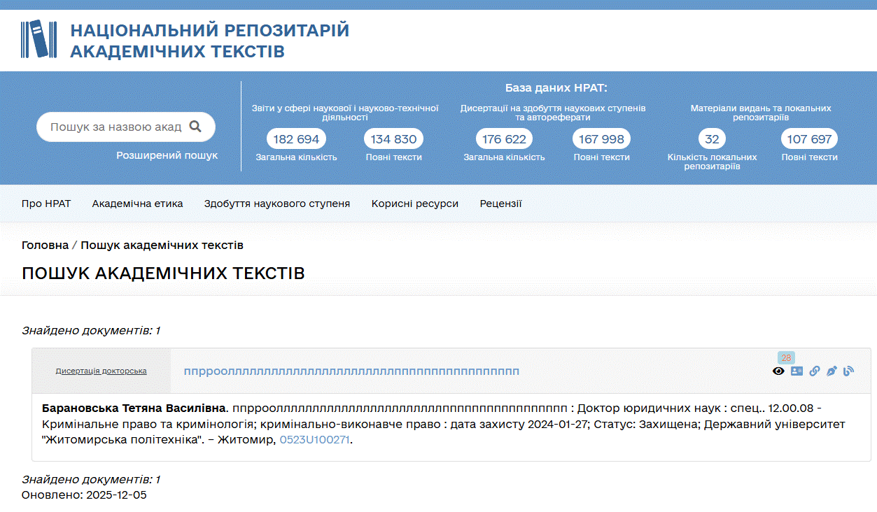 Один з недоліків цього Положення – у ньому нічого не написано про терміни, в які слід «вносити» дисертації до центрального репозитарію. А тому маємо випадок докторської дисертації Юлії Коваленко, яка була захищена 22.07.2025 у спецраді Д 26.861.05 Державного університету інформаційно-комунікаційних технологій, але навіть сьогодні, 29 грудня, так і не з’явилася на сайті НРАТ.
