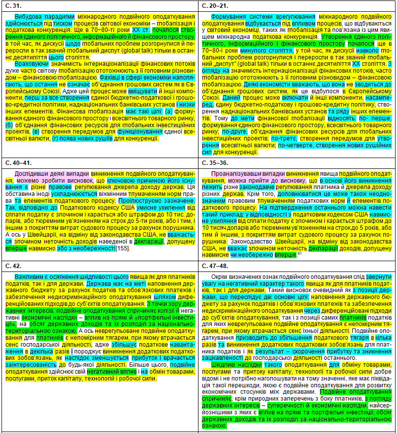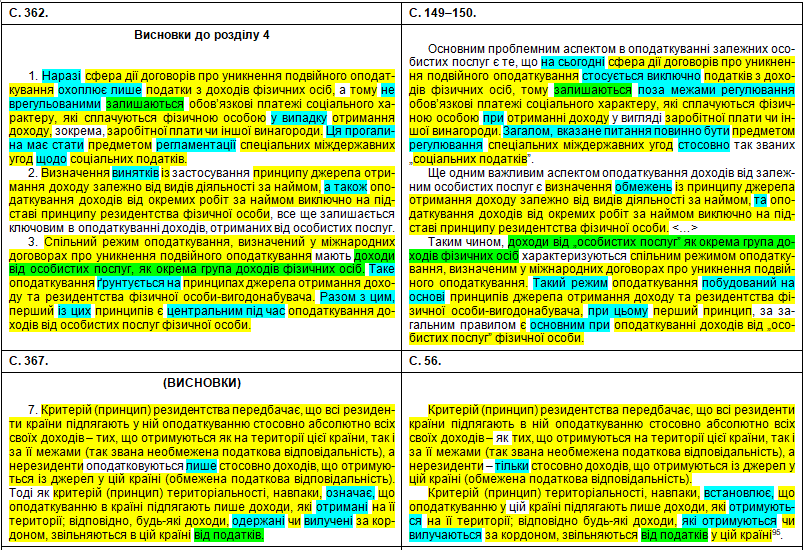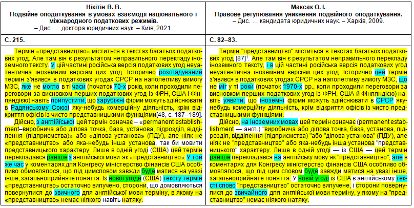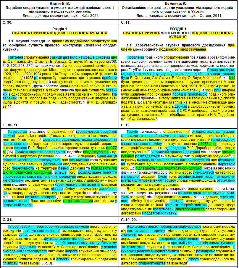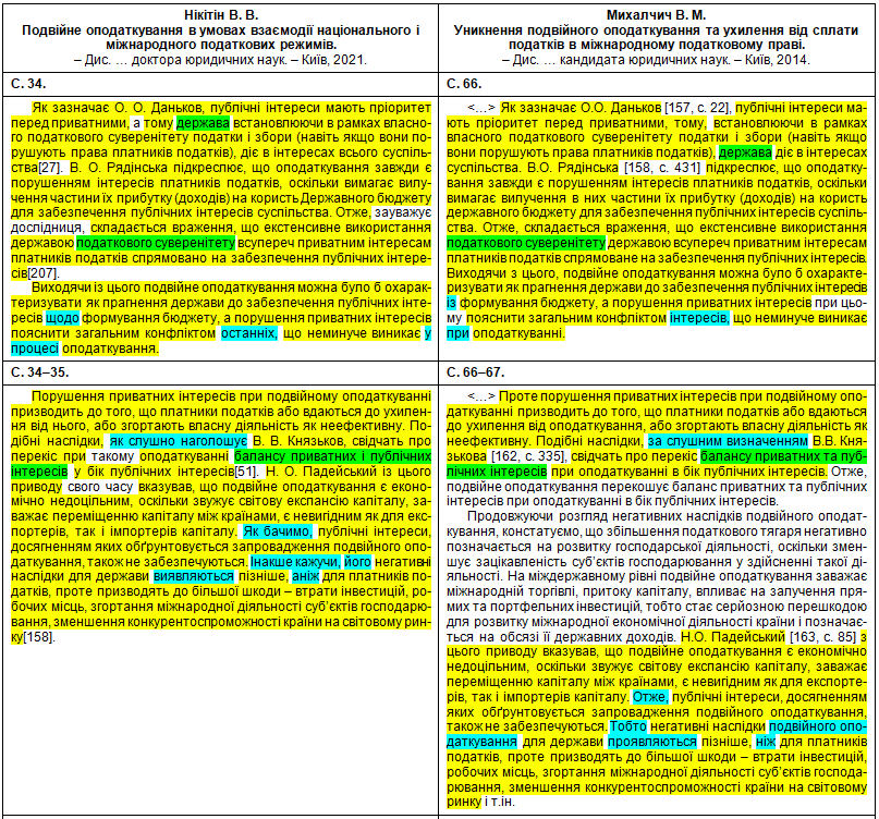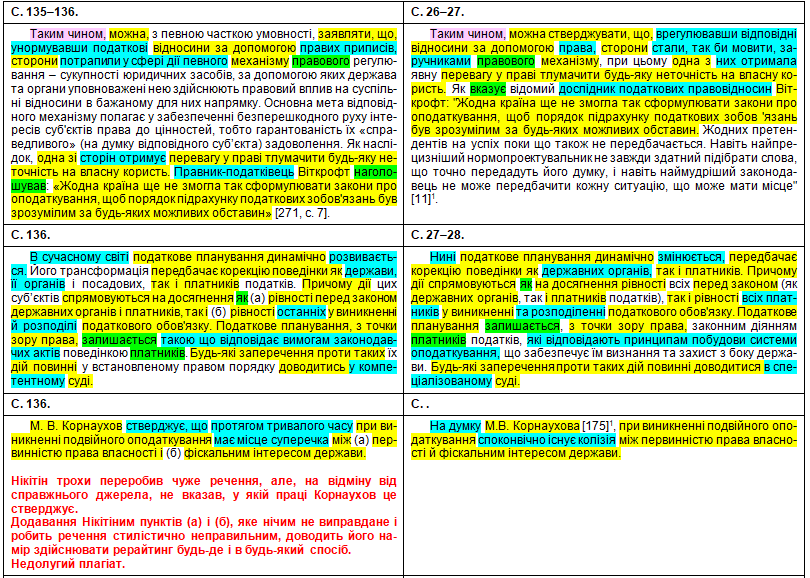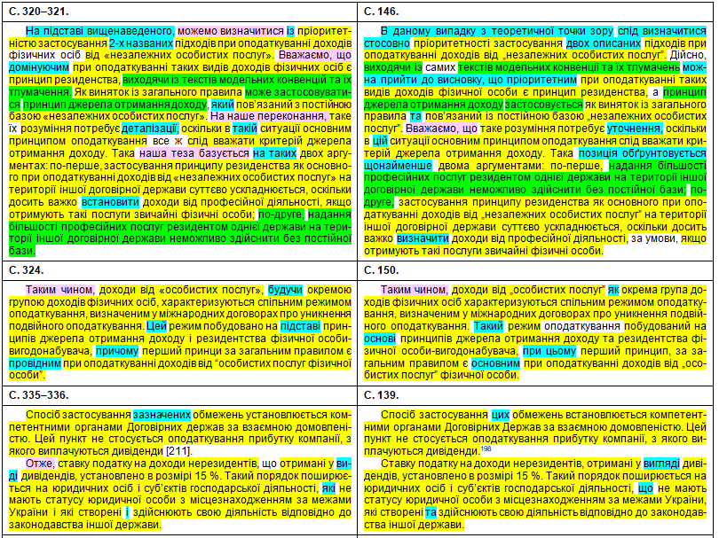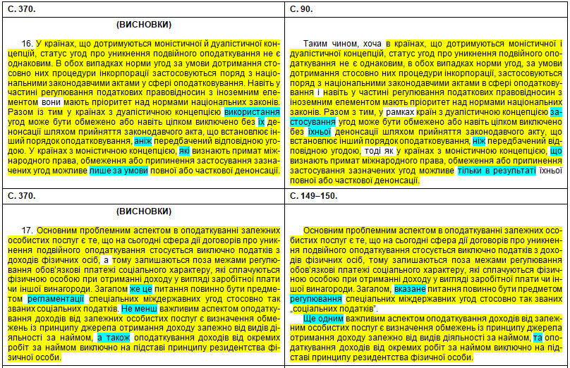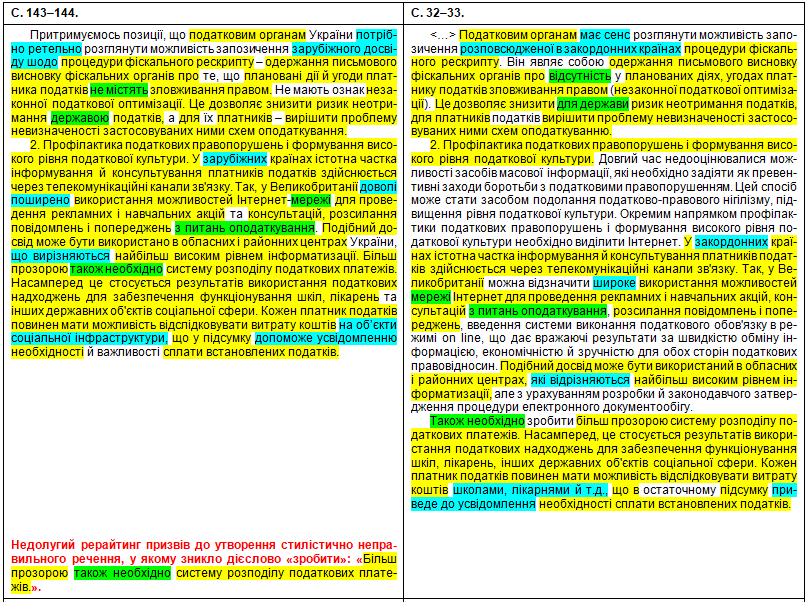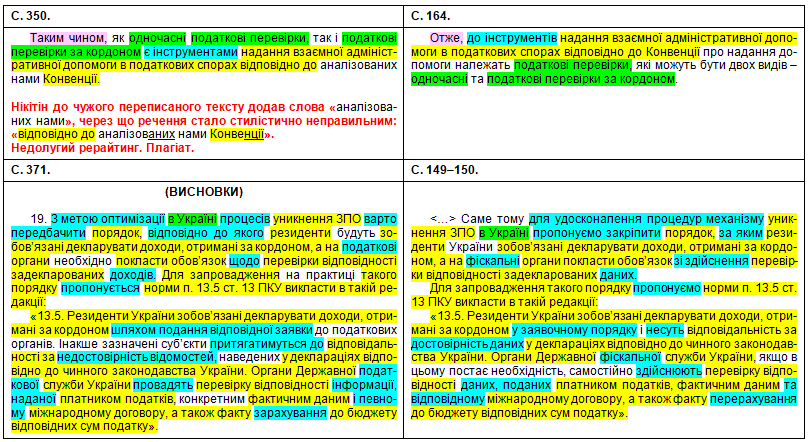 Щоб оцінити масштаби рерайтингу, подивимося на оці яскраві приклади «шаленої праці» особи, що займала «керівні посади у Міністерстві юстиції України» (збіги текстів виділені жовтим кольором, перефразування та синоніми – бірюзовим, перестановки слів місцями – зеленим; твердження особи про те, що це нібито вона щось робить особисто – фіолетовим). Крім «простого» тексту передирався й текст у «Висновки»: