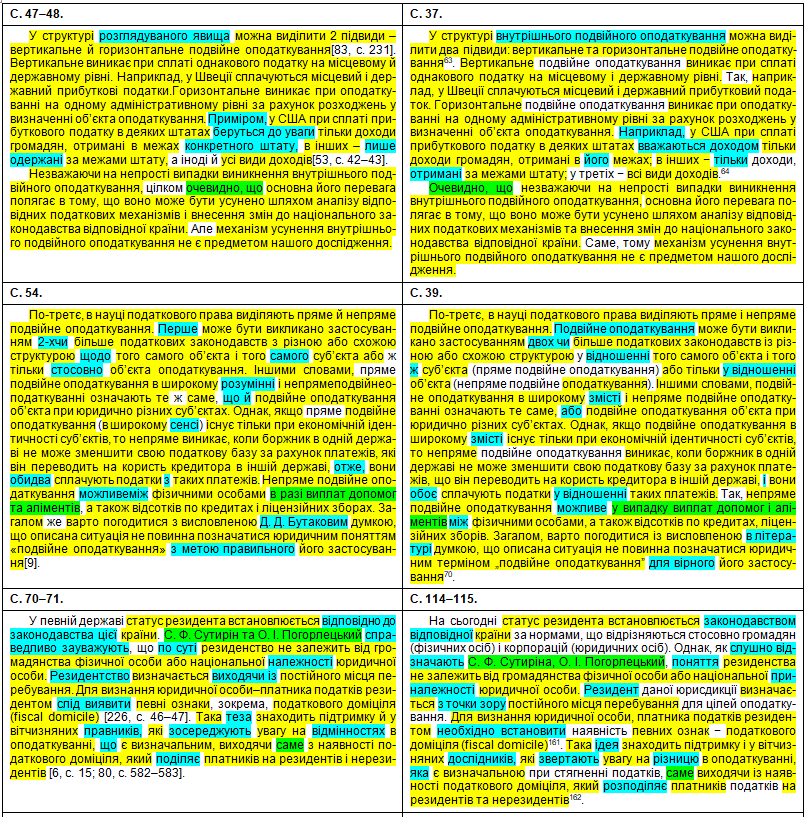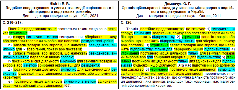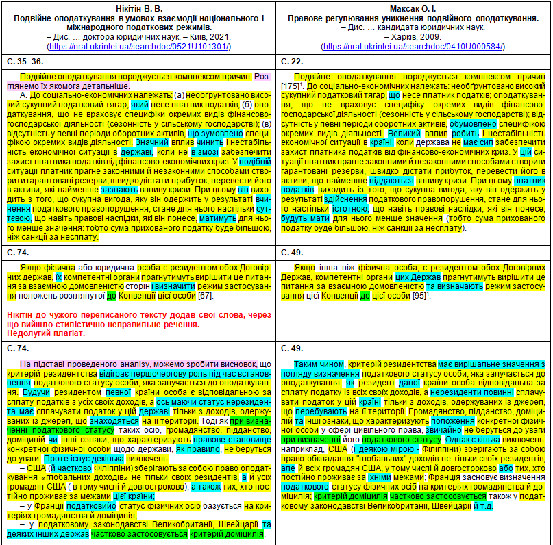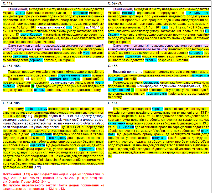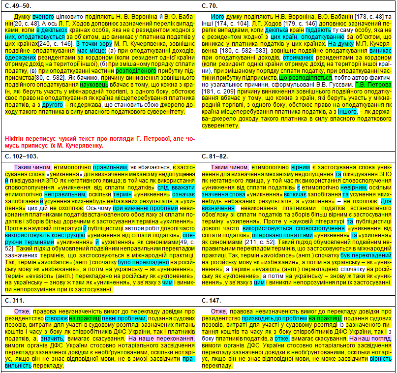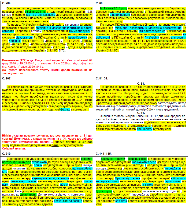Наприкінці передраних абзаців та навіть усередину чужого речення Нікітін упер непотрібне там фальшиве покликання [139] на свою власну працю: Нікітін В. В. До характеристики правових засад запобігання подвійного оподаткування в Україні. – Науковий вісник публічного та приватного права, 2020, вип. 3, т. 2, с. 166–170. (Джерело [177] у Нікітіна – те саме, що й [102] у Демянчука). До речі, щодо слова «хоплює» – це так у дисертації нашого великого вченого.