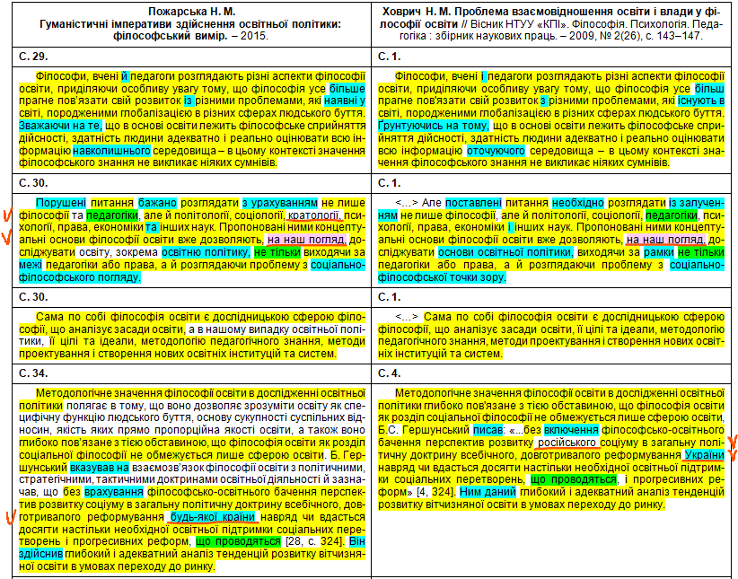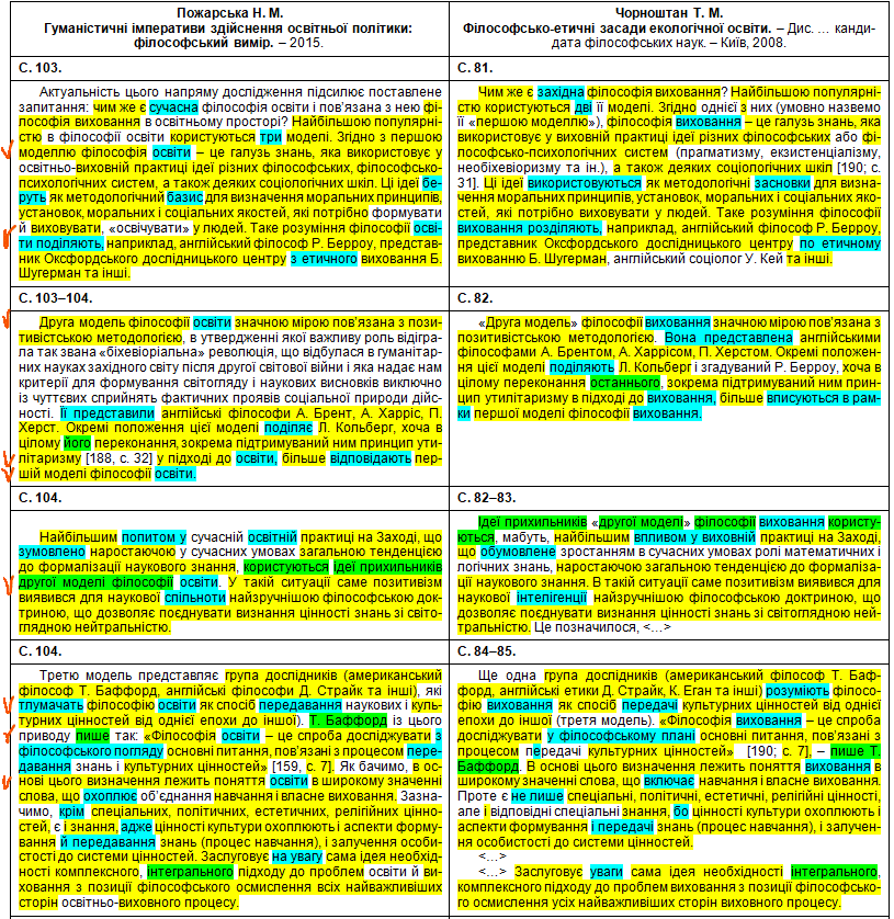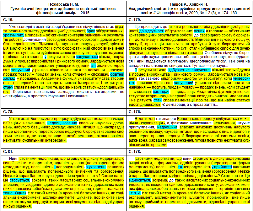 Збіги текстів виділені жовтим кольором, перефразування та синоніми – бірюзовим, перестановки слів місцями – зеленим, а твердження авторки про те, що це нібито вона щось пропонує, оцінює, розробила чи робить висновки – фіолетовим.