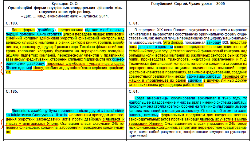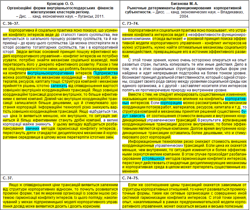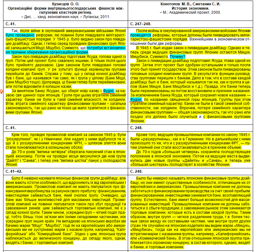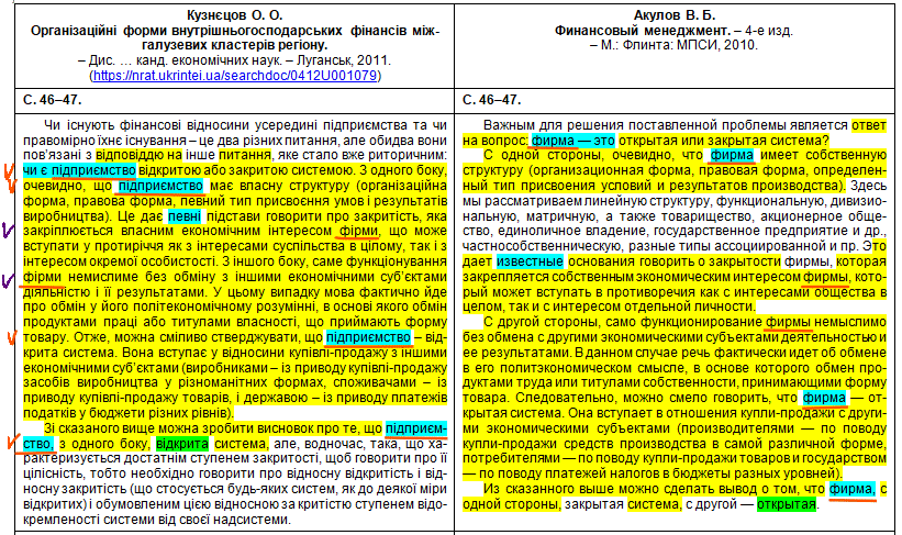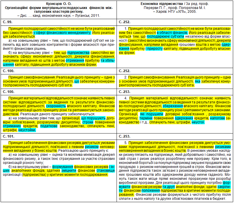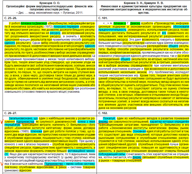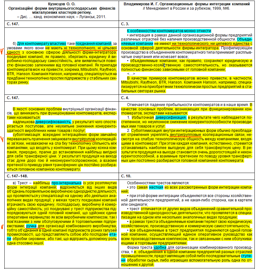 Як завжди, у порівняльних таблицях збіги текстів виділені жовтим кольором, перефразування та синоніми – бірюзовим, слова, що переставлені в інше місце, – зеленим, а вислови дисертанта про те, що це нібито він особисто про щось думає, щось пропонує, оцінює, розробив чи робить висновки – фіолетовим.