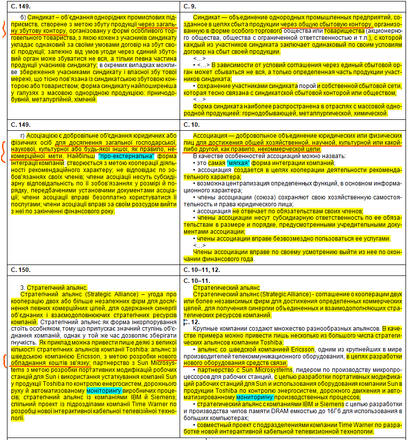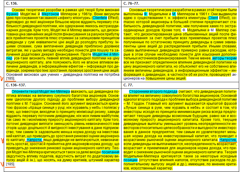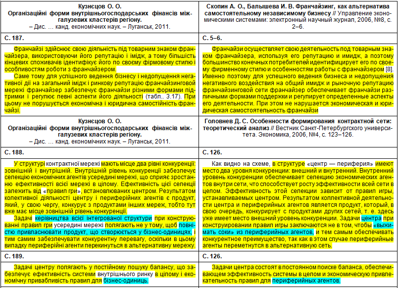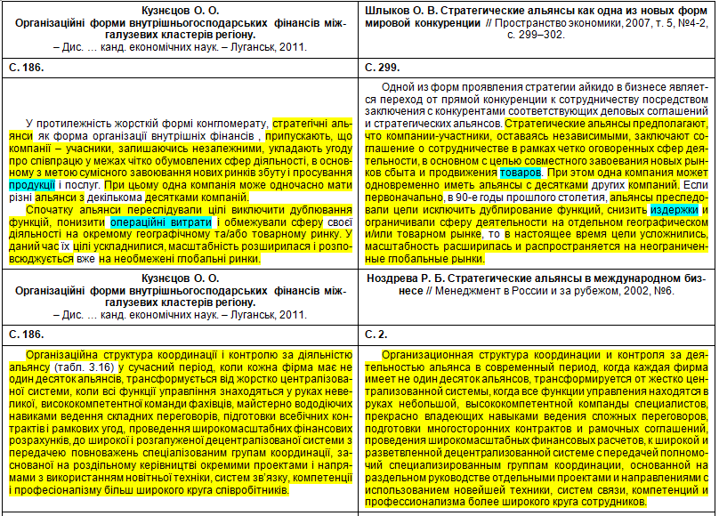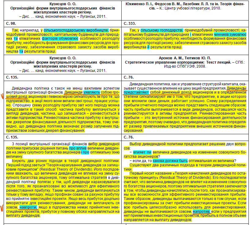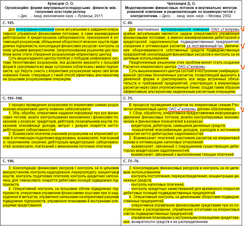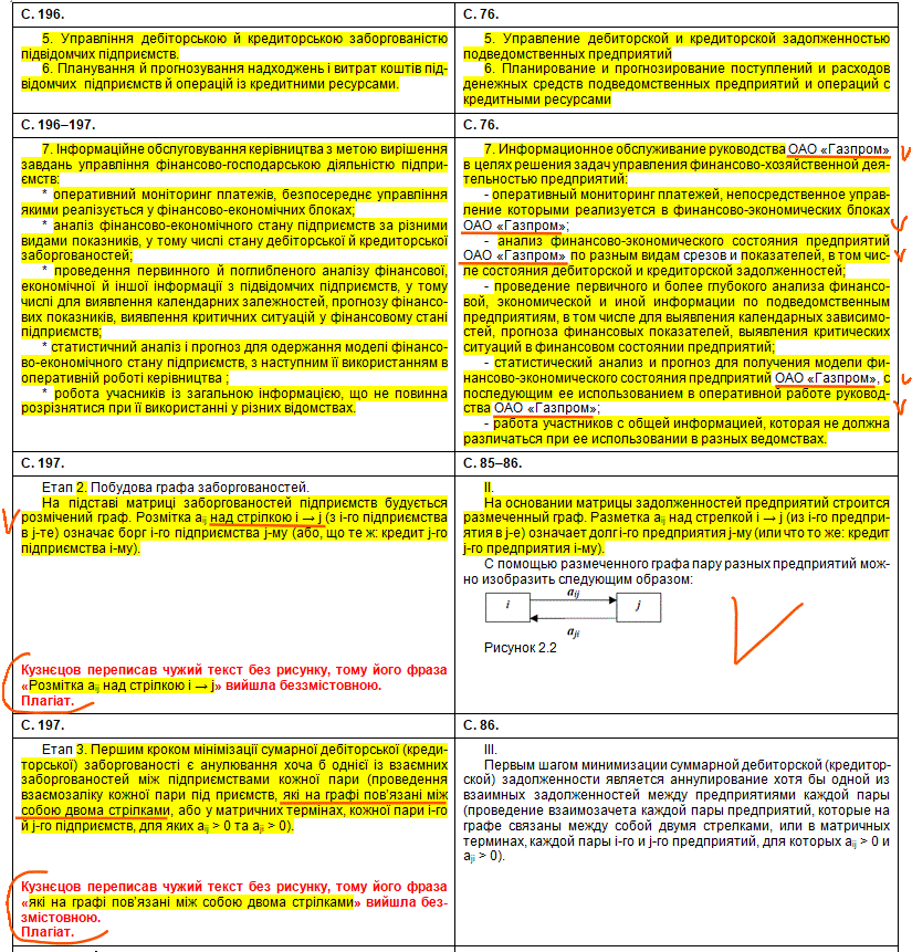 Як завжди, у порівняльних таблицях збіги текстів виділені жовтим кольором, перефразування та синоніми – бірюзовим, слова, що переставлені в інше місце, – зеленим, а вислови дисертанта про те, що це нібито він особисто про щось думає, щось пропонує, оцінює, розробив чи робить висновки – фіолетовим.