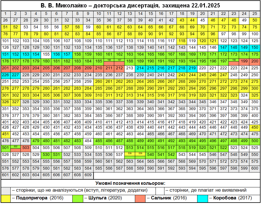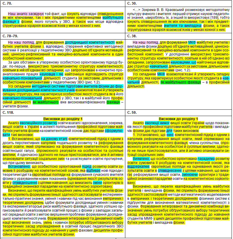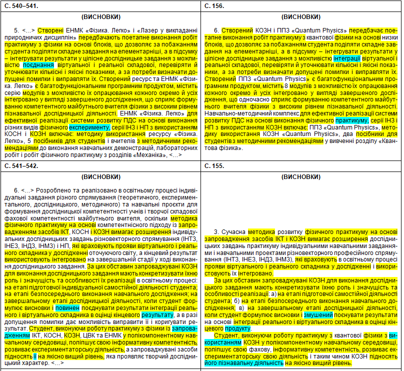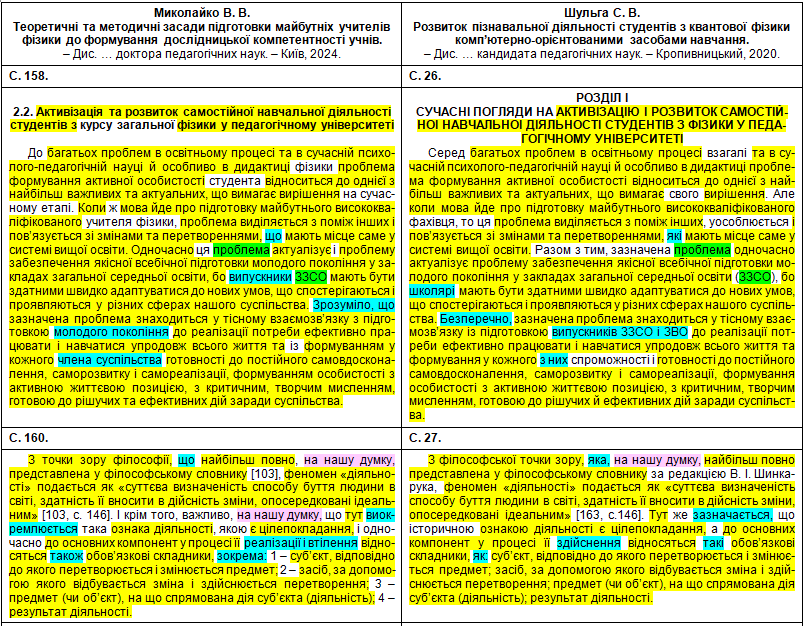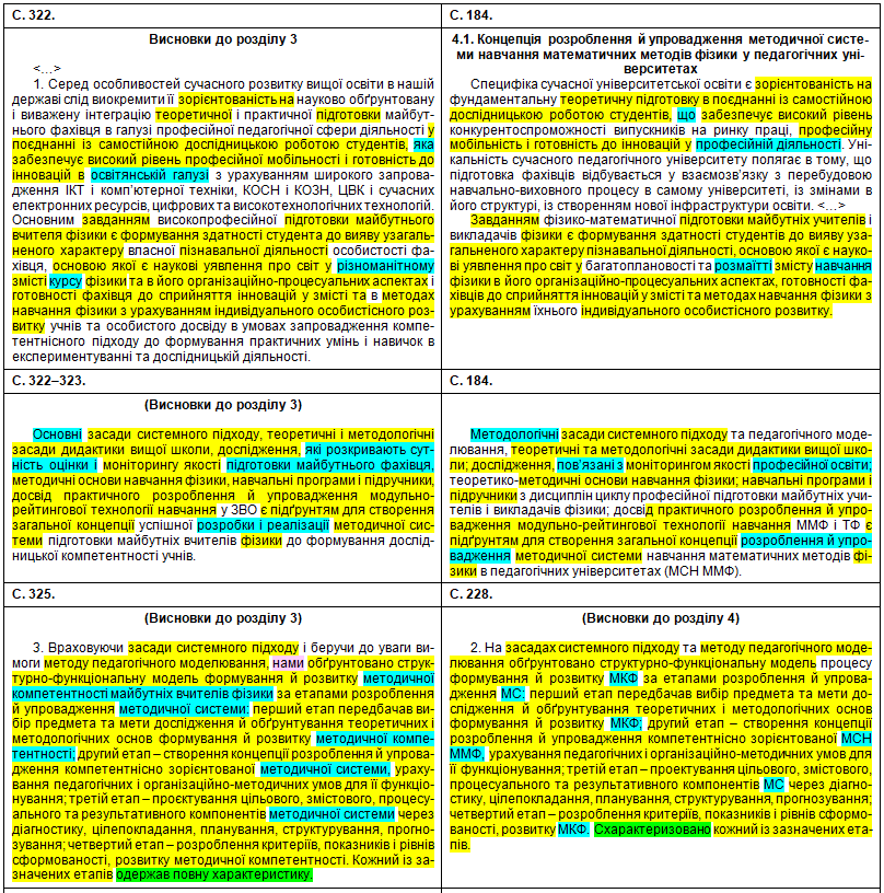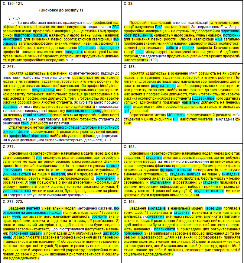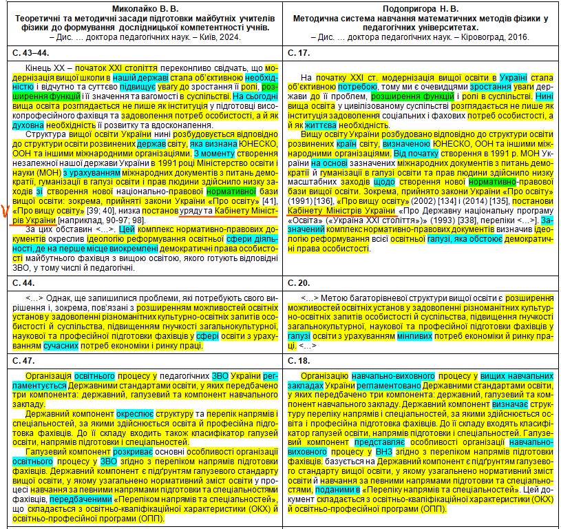 Полюбуємося на зведену табличку, де кольорами показані «забруднені» сторінки, а також і безпосередньо на самі збіги в тексті. Що цікаво – Миколайко підійшов до роботи творчо, з натхненням: шматки з повним збігом трапляються нечасто, в основному пан активно займався рерайтингом, зокрема, поміняв студентів на учнів, викладачів на вчителів, «математичний» на «методичний». Рерайтинг інколи вийшов недолугий: наприклад, на с. 43 читаємо фразу «уряду та Кабінету Міністрів України» (Миколайко до чужого тексту додав слово «уряду», не знаючи, що насправді уряд – це і є Кабінет міністрів); а на с. 154 є фраза «індивідуального діяльнісного особистого досвіду» (тут було дописано слово «особистого», хоча «індивідуальне» і «особисте» – це одне й теж).