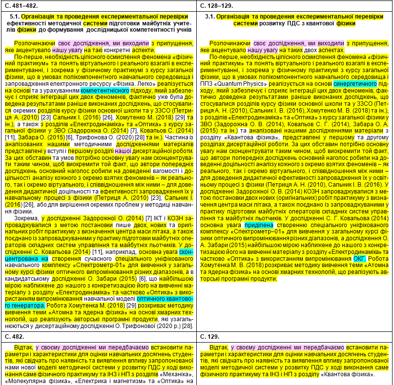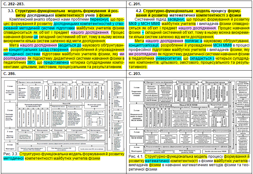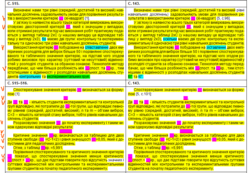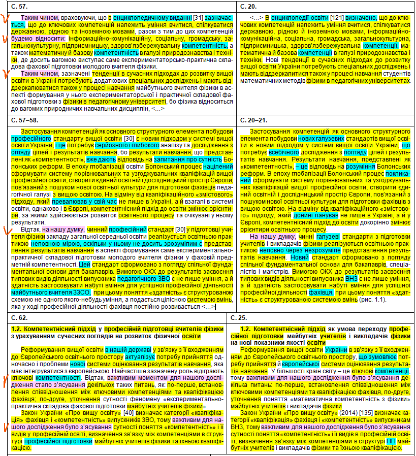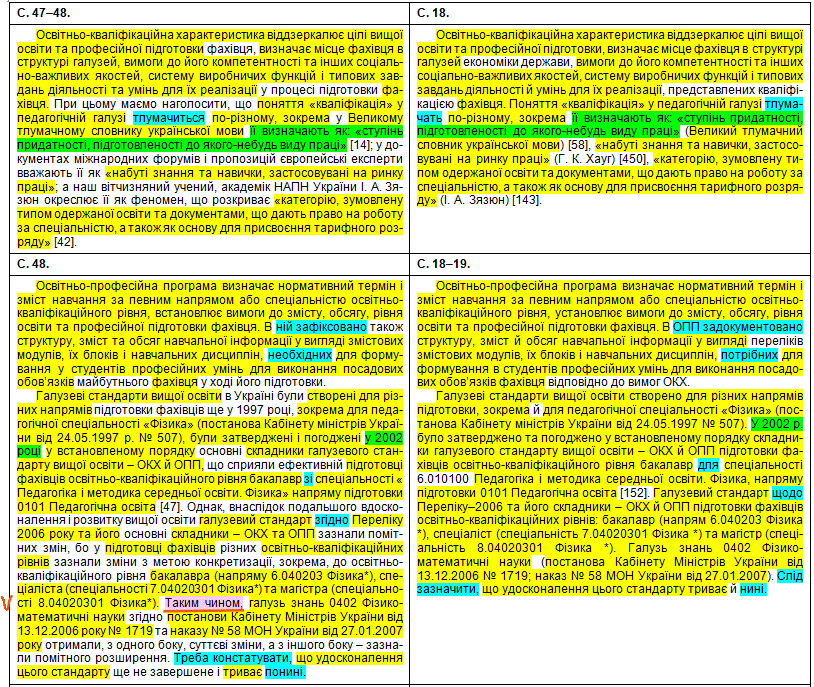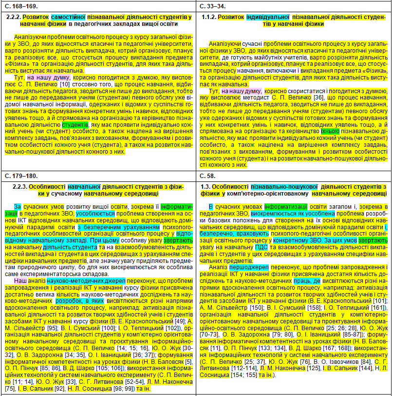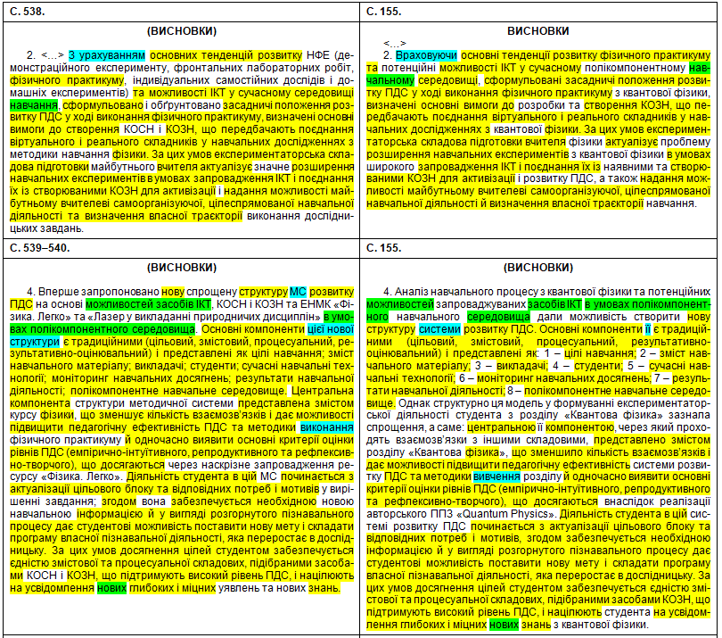 Полюбуємося на зведену табличку, де кольорами показані «забруднені» сторінки, а також і безпосередньо на самі збіги в тексті. Що цікаво – Миколайко підійшов до роботи творчо, з натхненням: шматки з повним збігом трапляються нечасто, в основному пан активно займався рерайтингом, зокрема, поміняв студентів на учнів, викладачів на вчителів, «математичний» на «методичний». Рерайтинг інколи вийшов недолугий: наприклад, на с. 43 читаємо фразу «уряду та Кабінету Міністрів України» (Миколайко до чужого тексту додав слово «уряду», не знаючи, що насправді уряд – це і є Кабінет міністрів); а на с. 154 є фраза «індивідуального діяльнісного особистого досвіду» (тут було дописано слово «особистого», хоча «індивідуальне» і «особисте» – це одне й теж).