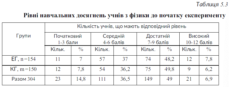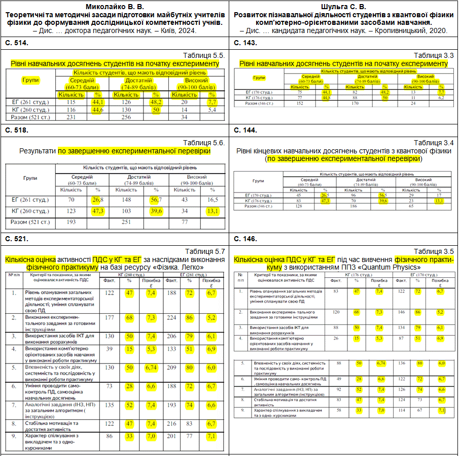● у таблиці 5.5 – по експериментальній групі усі дані в процентах є такими самими, як і в дисертації Шульги; по контрольній групі – ідентичні дані по достатньому рівню (50%) і схожі дані по середньому рівню (44,6% проти 44,8%);