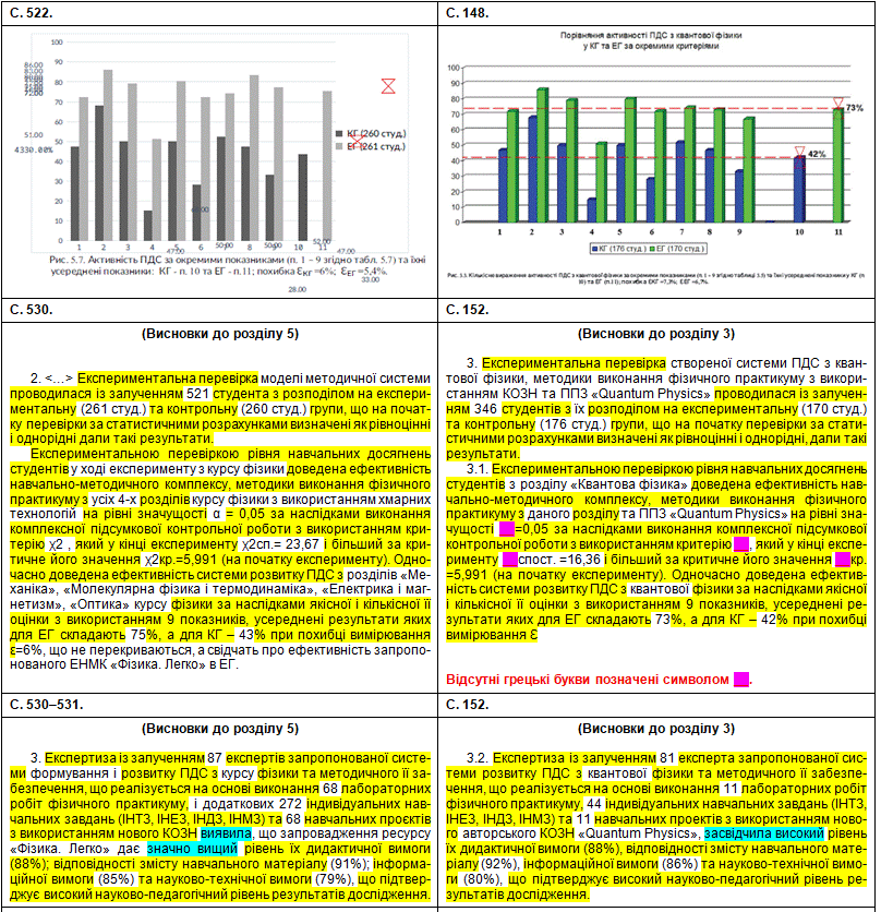 Таким чином, із 434 сторінок основного тексту маємо плагіат на 248 сторінках, що складає 57%. І не просто в основному тексті, але й у висновках до розділу 1, у висновках до розділу 3, у висновках до розділу 5, а також і в головних «ВИСНОВКАХ» до усієї так званої дисертації.