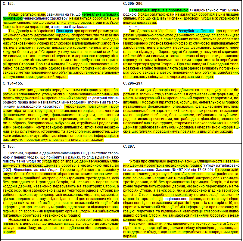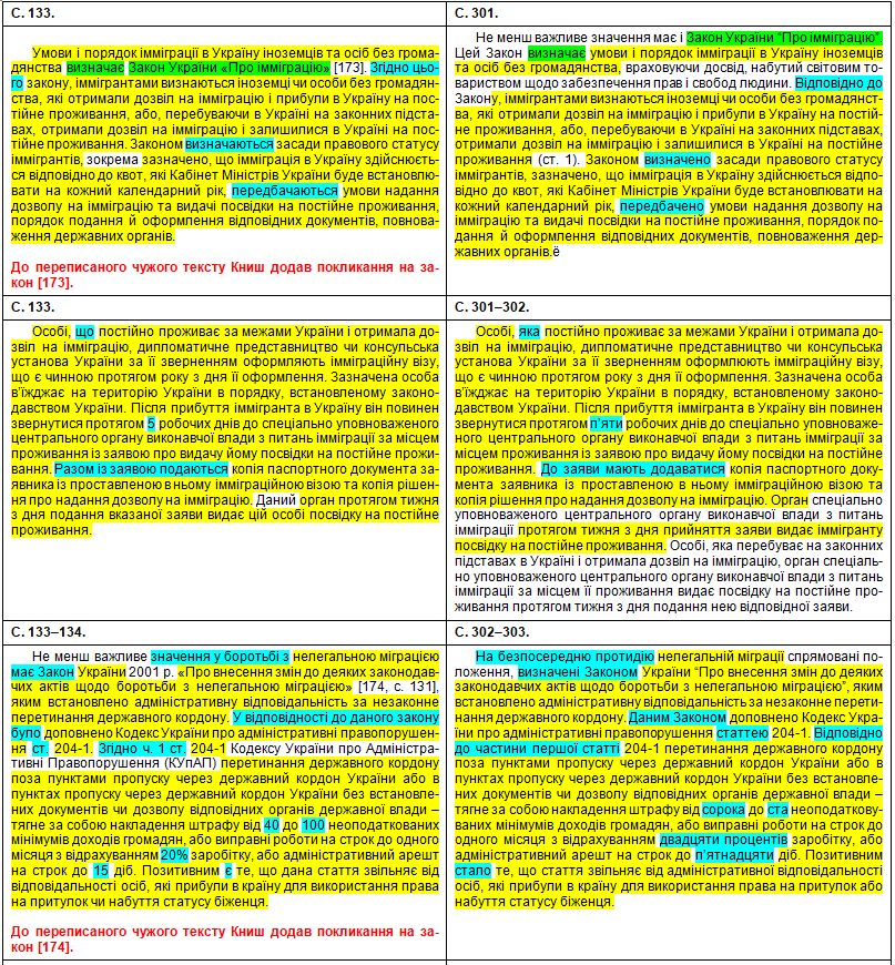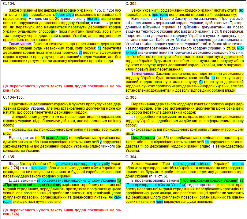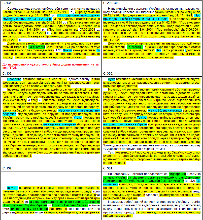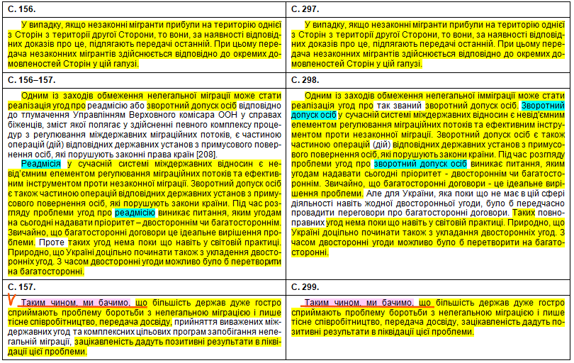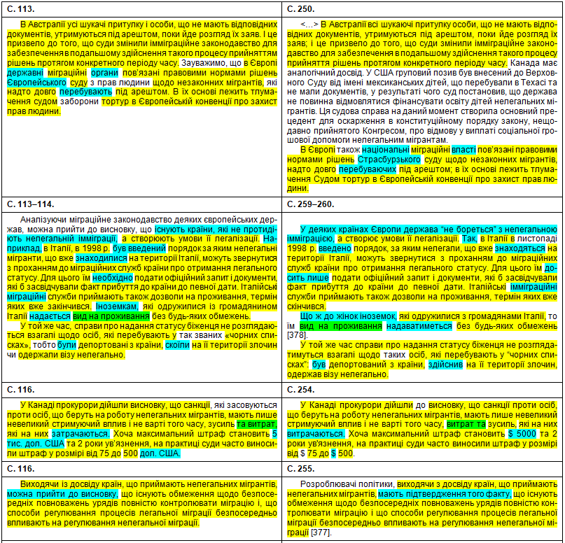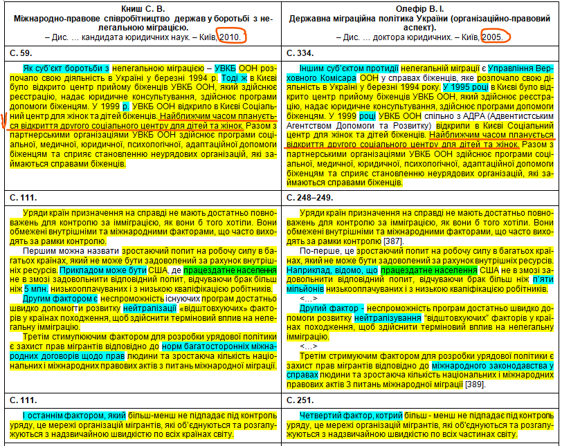 У порівняльній таблиці збіги текстів виділені жовтим кольором, перефразування та синоніми – бірюзовим, слова, що переставлені в інше місце, – зеленим, а вислови дисертанта про те, що це нібито він особисто про щось думає, щось пропонує, оцінює, розробив чи робить висновки – фіолетовим.
